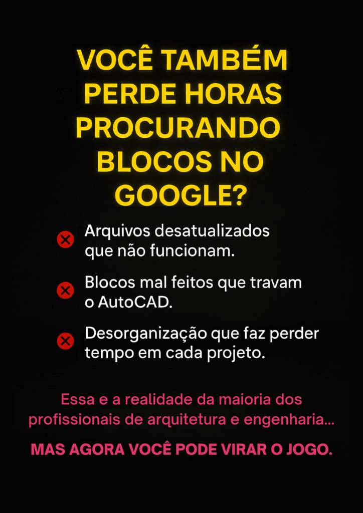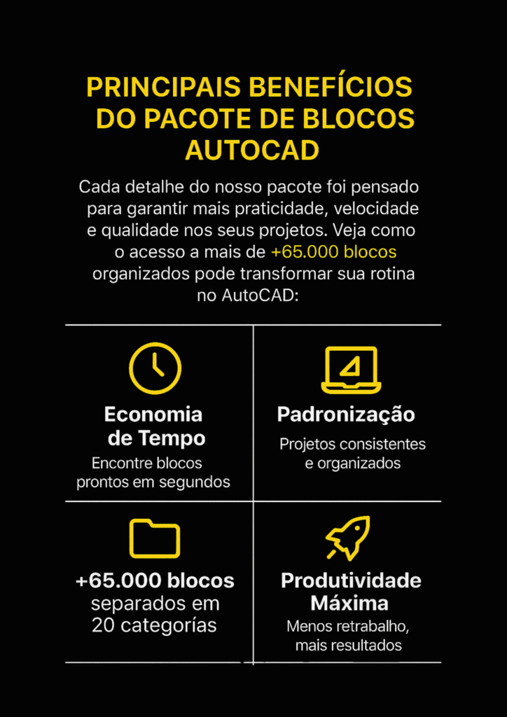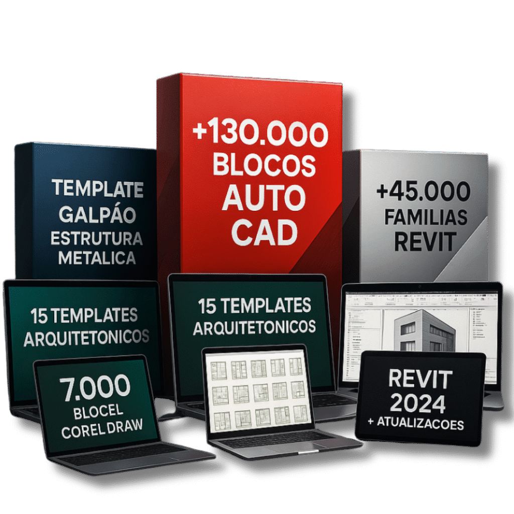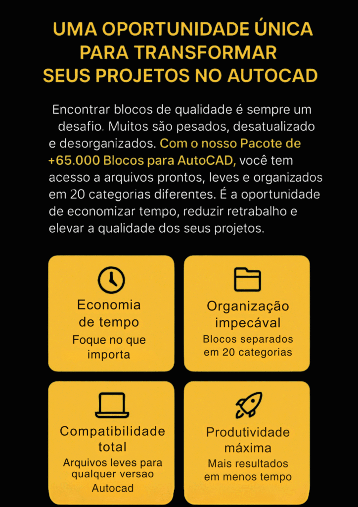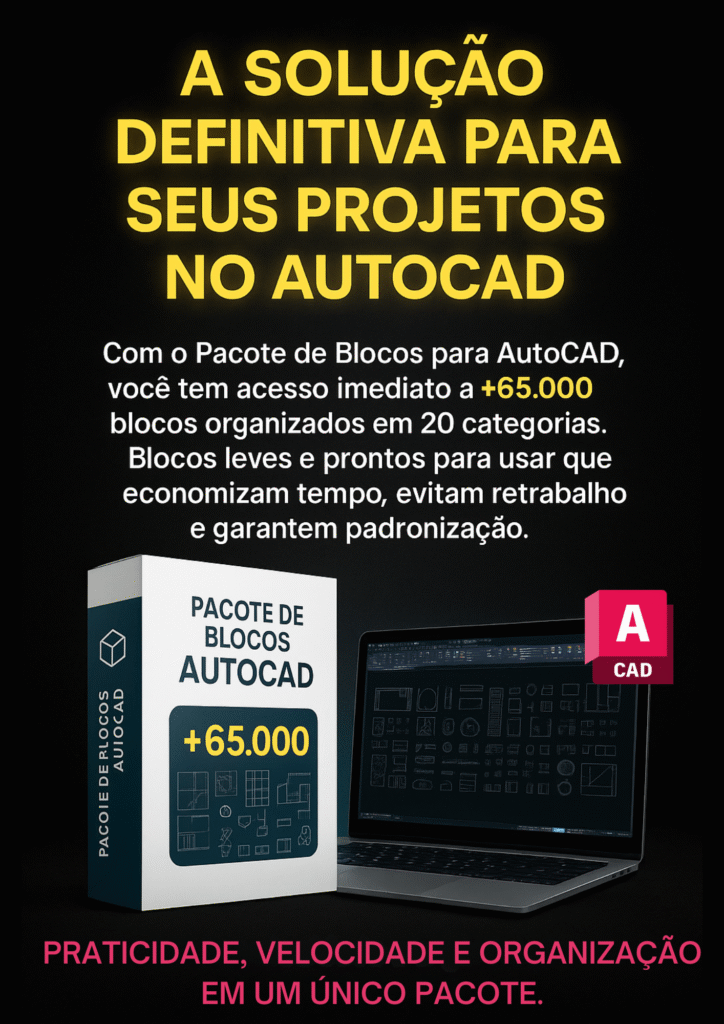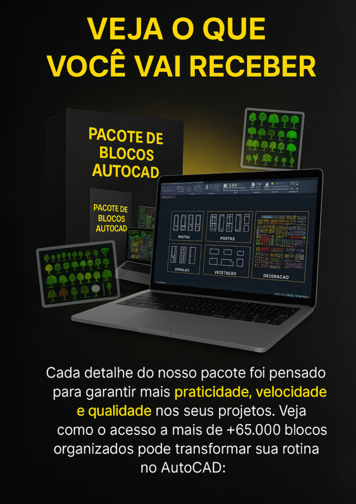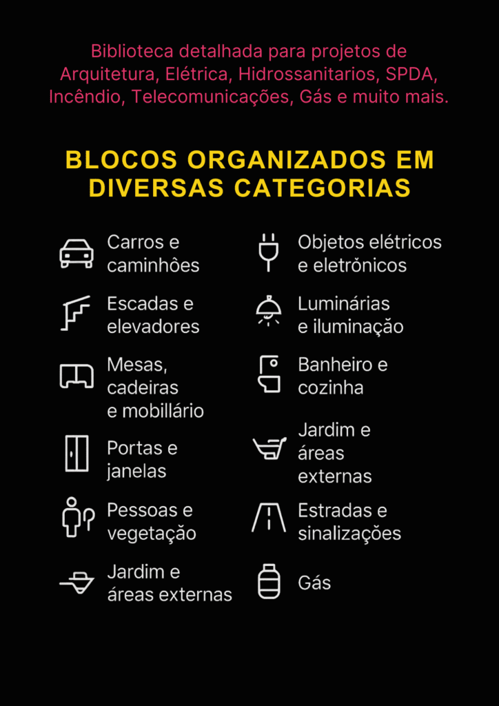 Mais de 65.000 blocos organizados em 20 categorias, prontos para inserir em qualquer versão do AutoCAD. Inclui portas, janelas, móveis, banheiros, cozinhas, iluminação, árvores, veículos, pessoas, símbolos técnicos e pranchas ABNT/ISO.